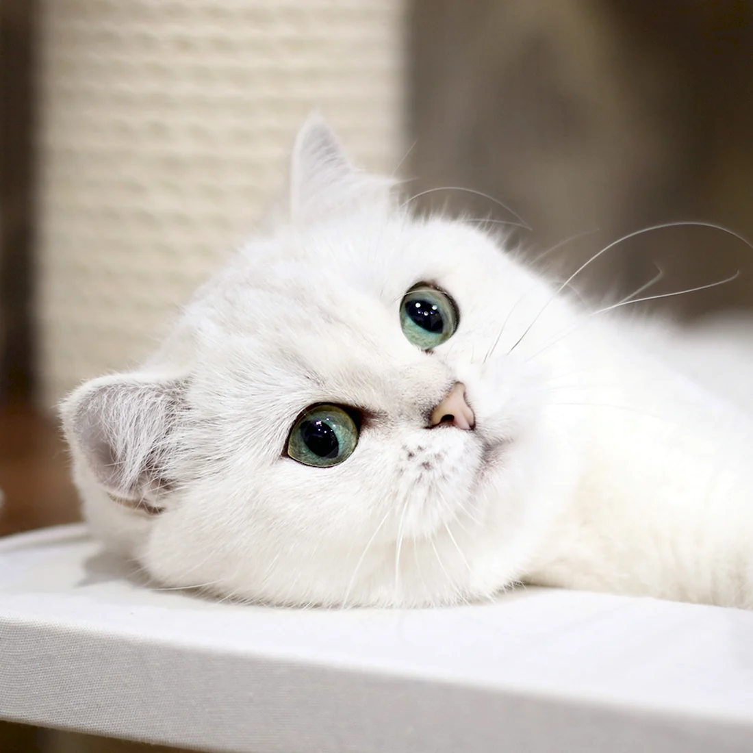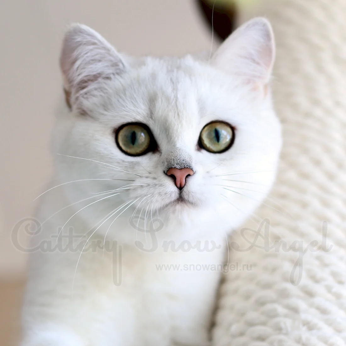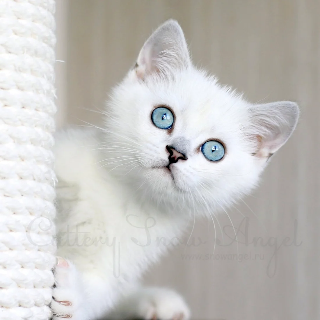 Прекрасный пушистый котик с нежным белым мехом и удивительными глазами, словно две глубокие лазурные озера.