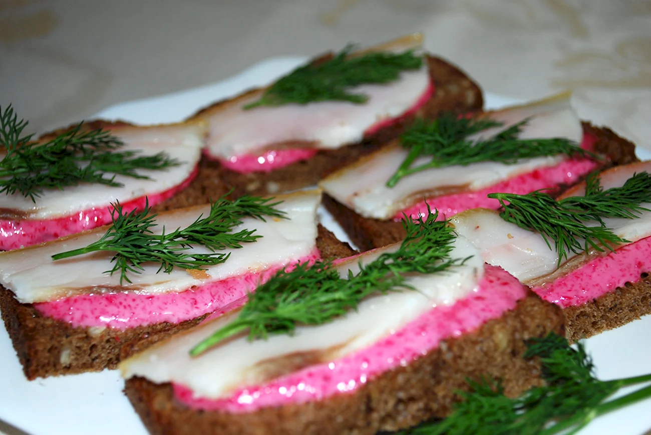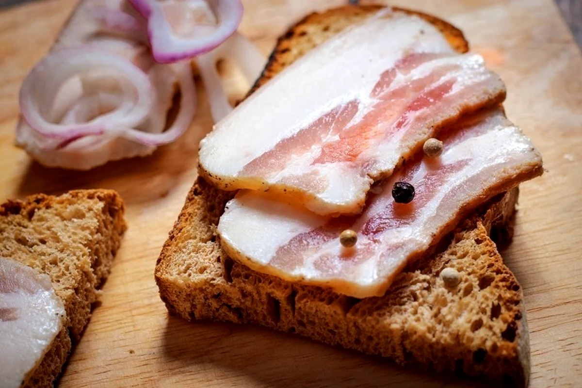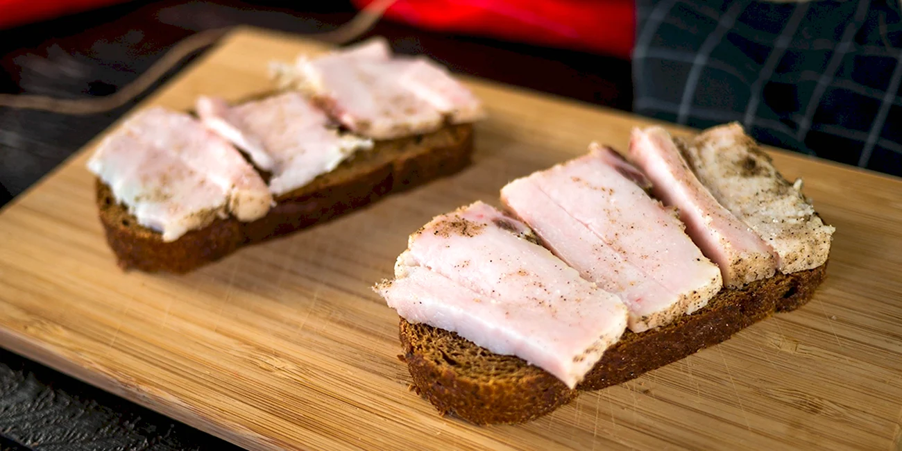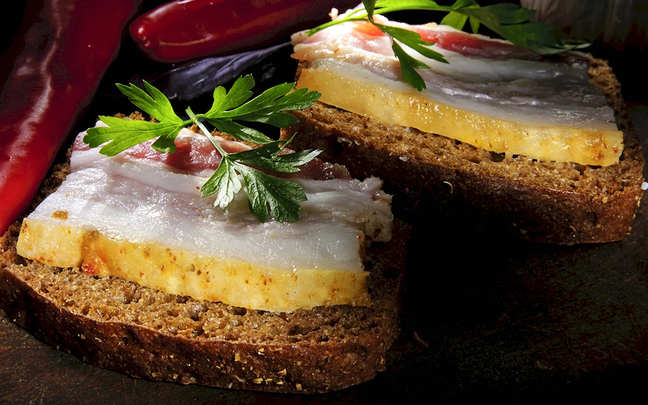 Идеальный вариант завтрака или перекуса — сочные бутерброды с аппетитным салом на ароматном черном хлебе.