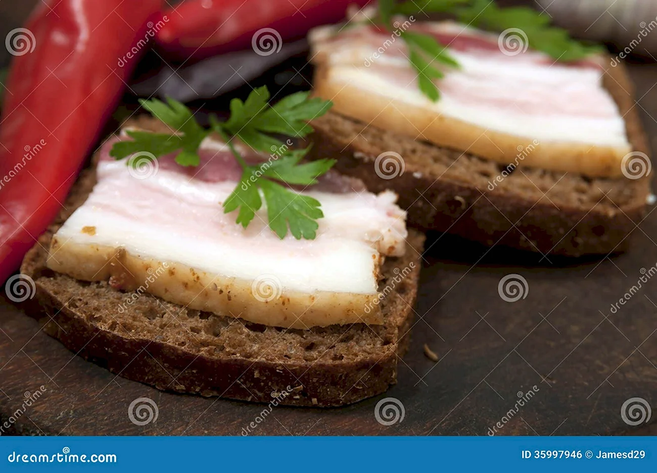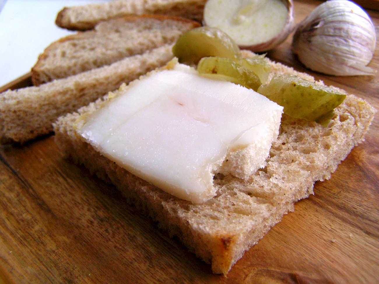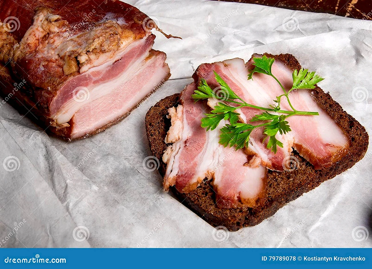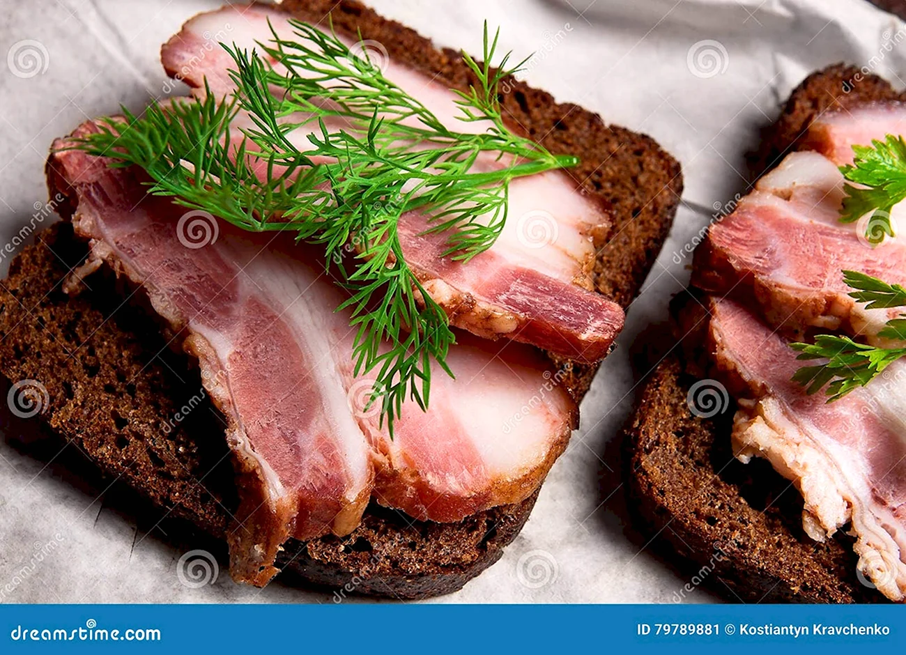 Идеальный вариант завтрака или перекуса — сочные бутерброды с аппетитным салом на ароматном черном хлебе.