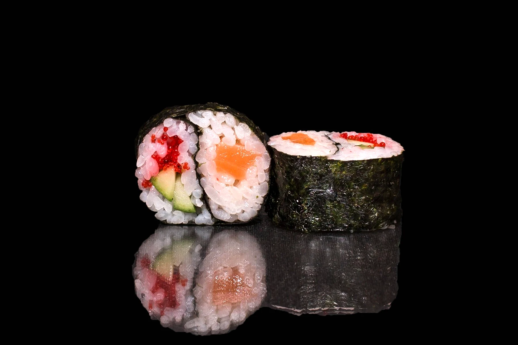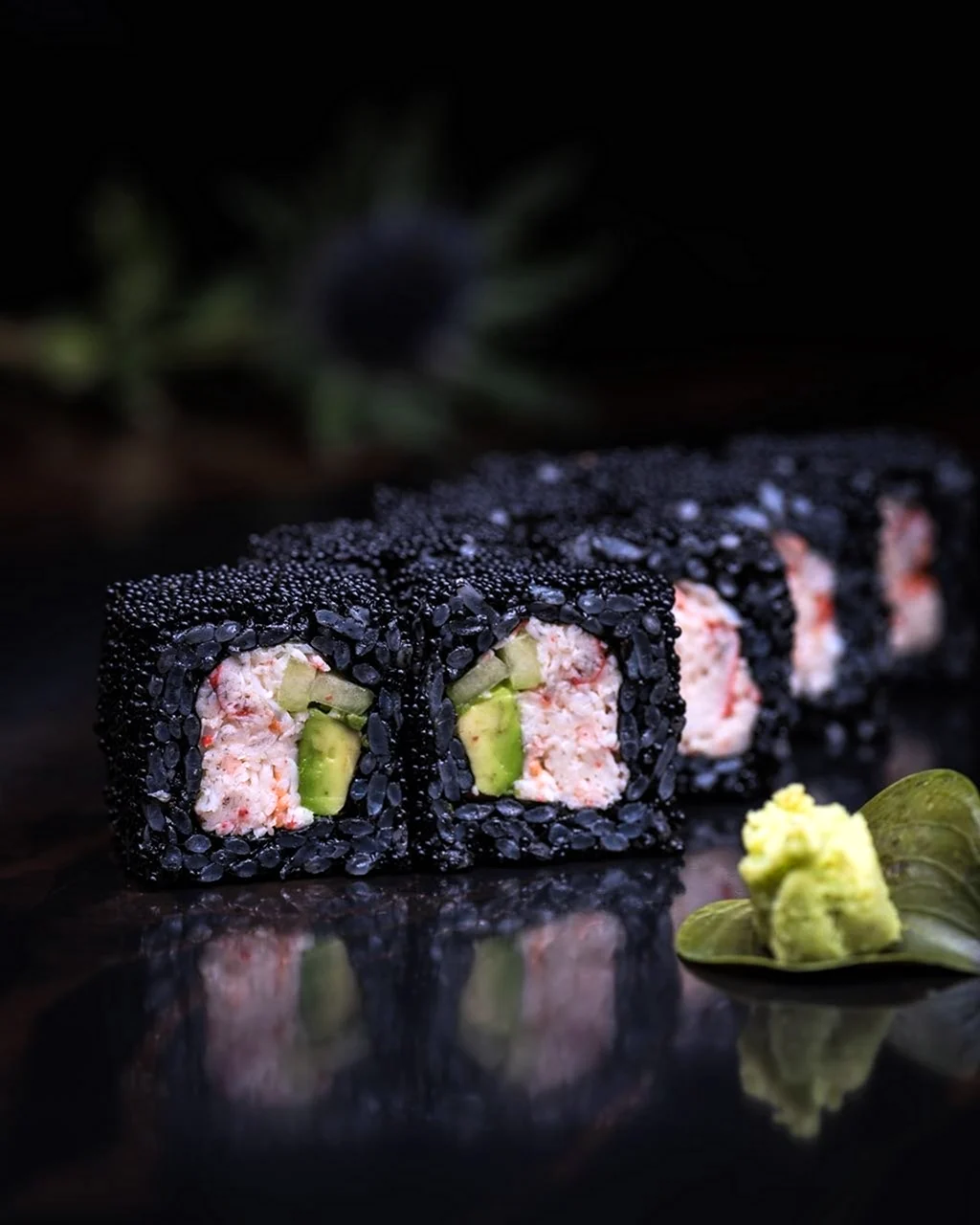 Этот элегантный черный фон создает потрясающую атмосферу для презентации изысканных блюд суши.