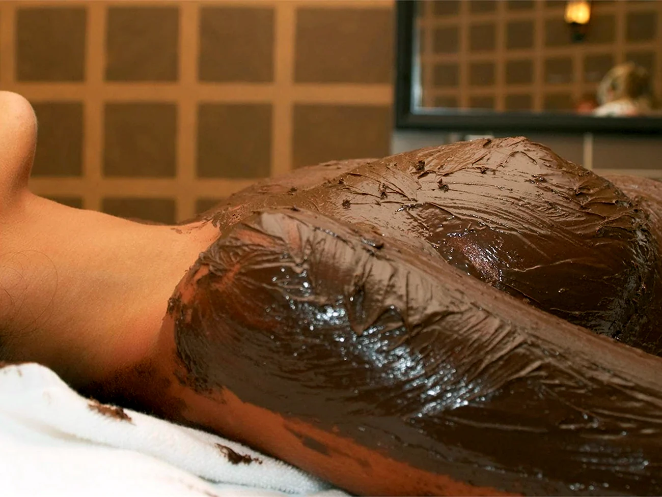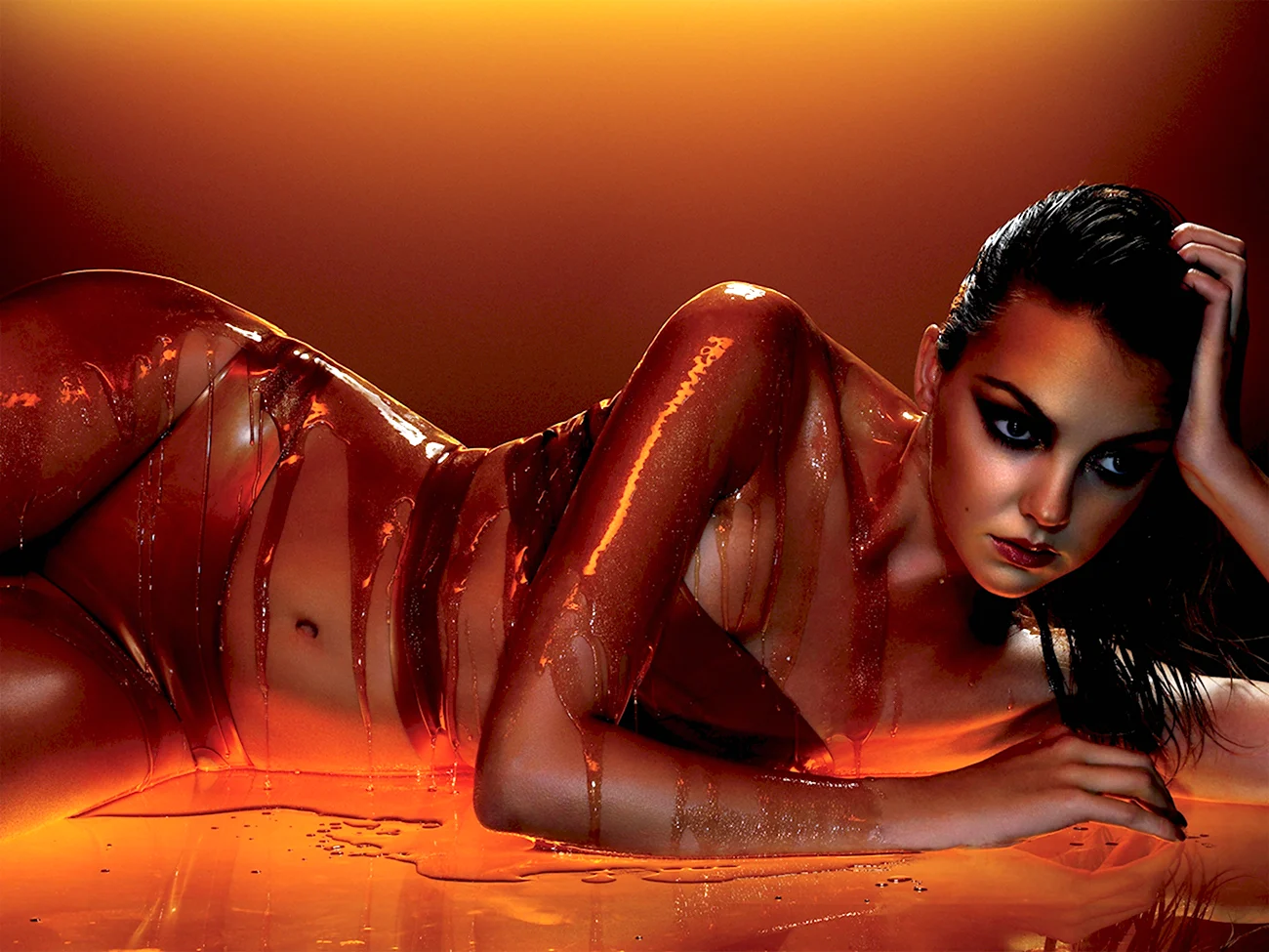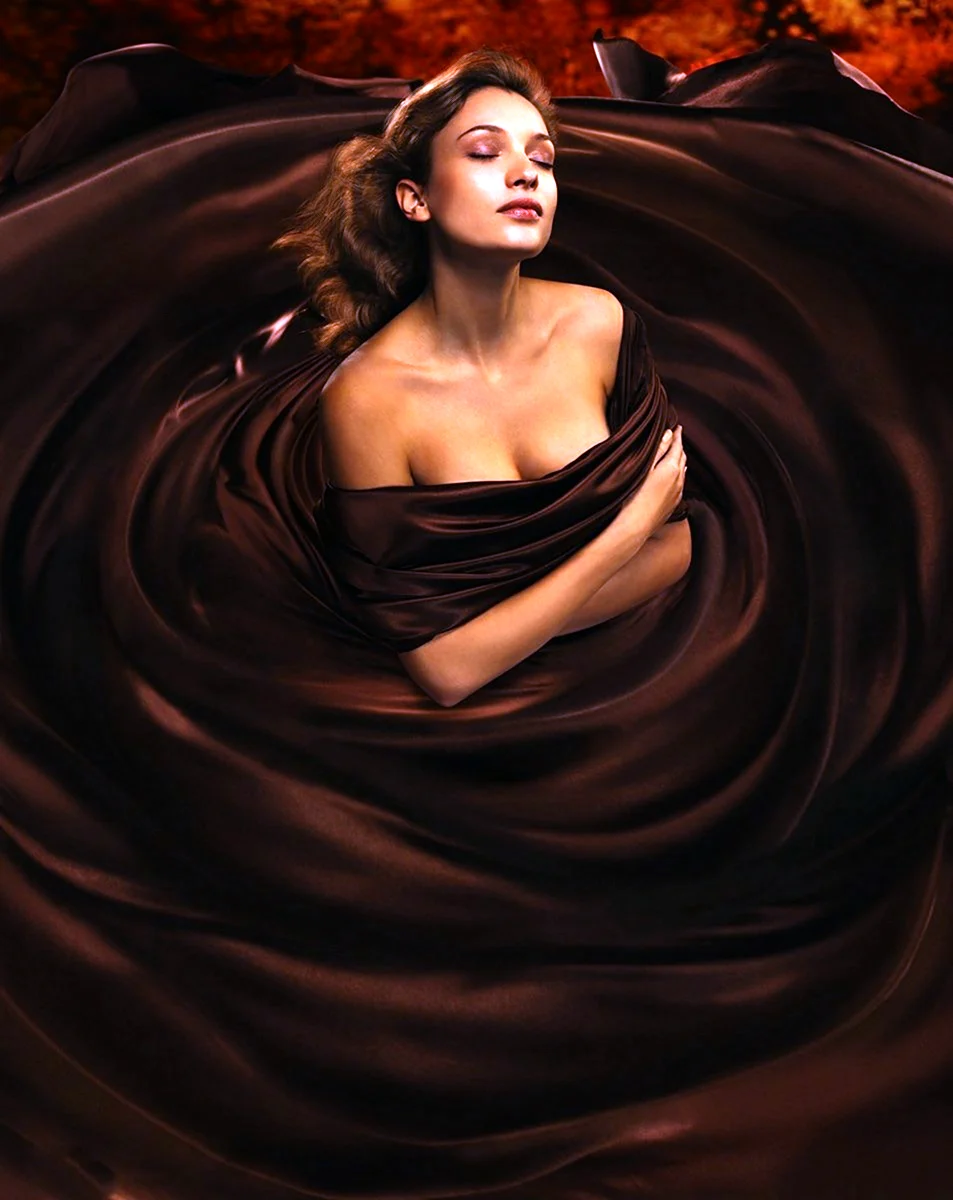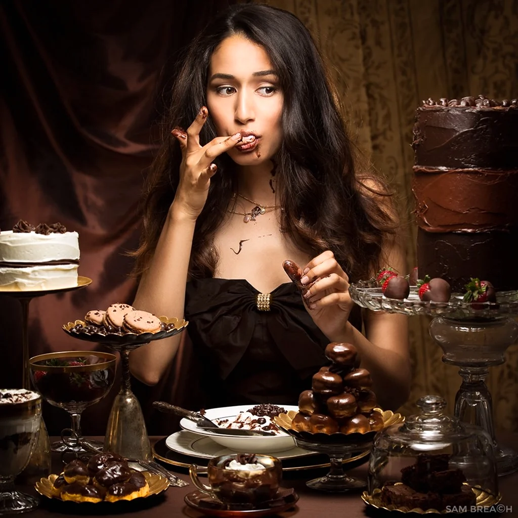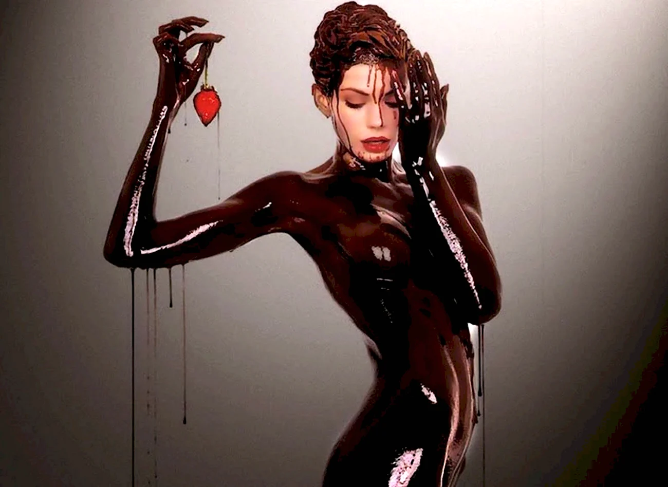 Очаровательная дама, окунутая в мир шоколада, словно главная героиня фильма Сладкая жизнь. Ее взгляд так и манит попробовать этот нежный и ароматный десерт прямо с ее кожи. Кажется, что каждая клеточка ее тела пропитана сладостью и шоколадным наслаждением. Как же мне хочется стать той удачливой ложкой, которая первой окунется в этот великолепный океан сладости!