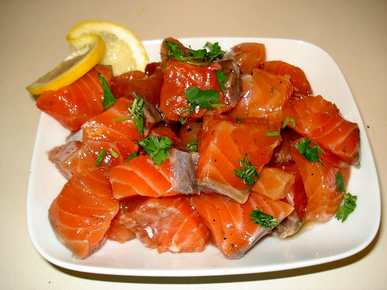 Как же аппетитно выглядят эти кусочки свежей семги, прямо захотелось приготовить что-то похожее сегодня на ужин.