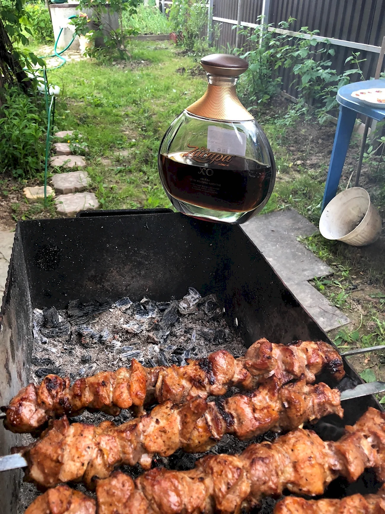 Мерцающие угли и аппетитные кусочки мяса на фоне бокала коньяка создают идеальную атмосферу для приятного времяпрепровождения.