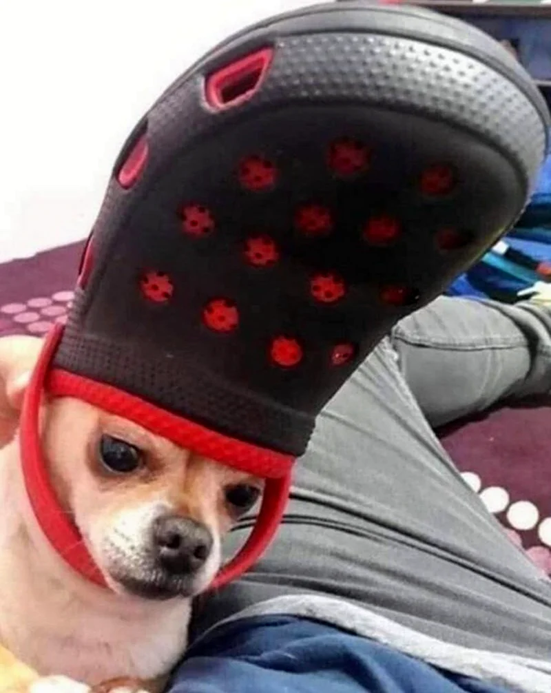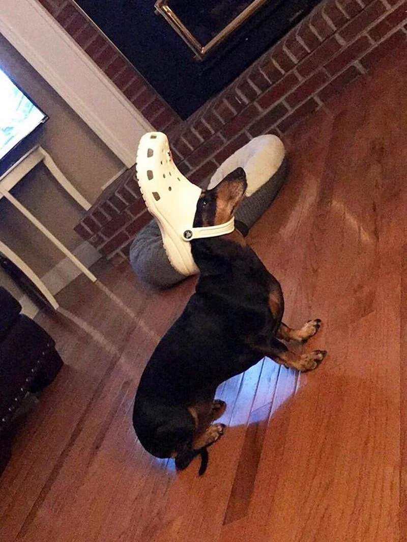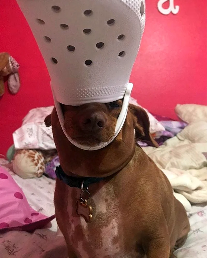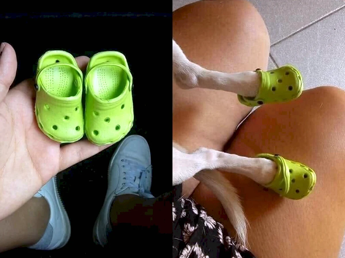 Какой стильняшка! Собака, похоже, готова покорять мир в этих шикарных кроксах!