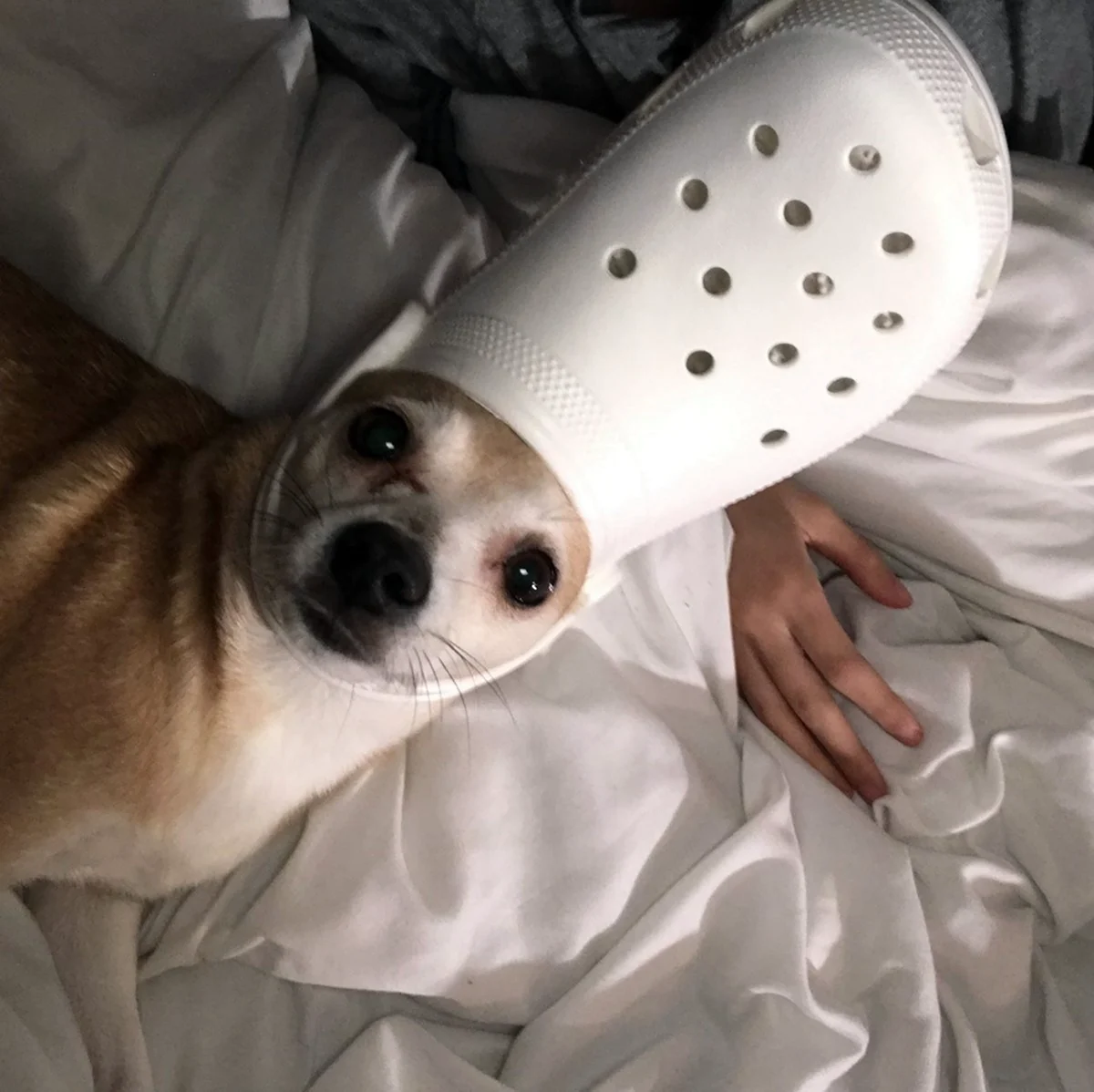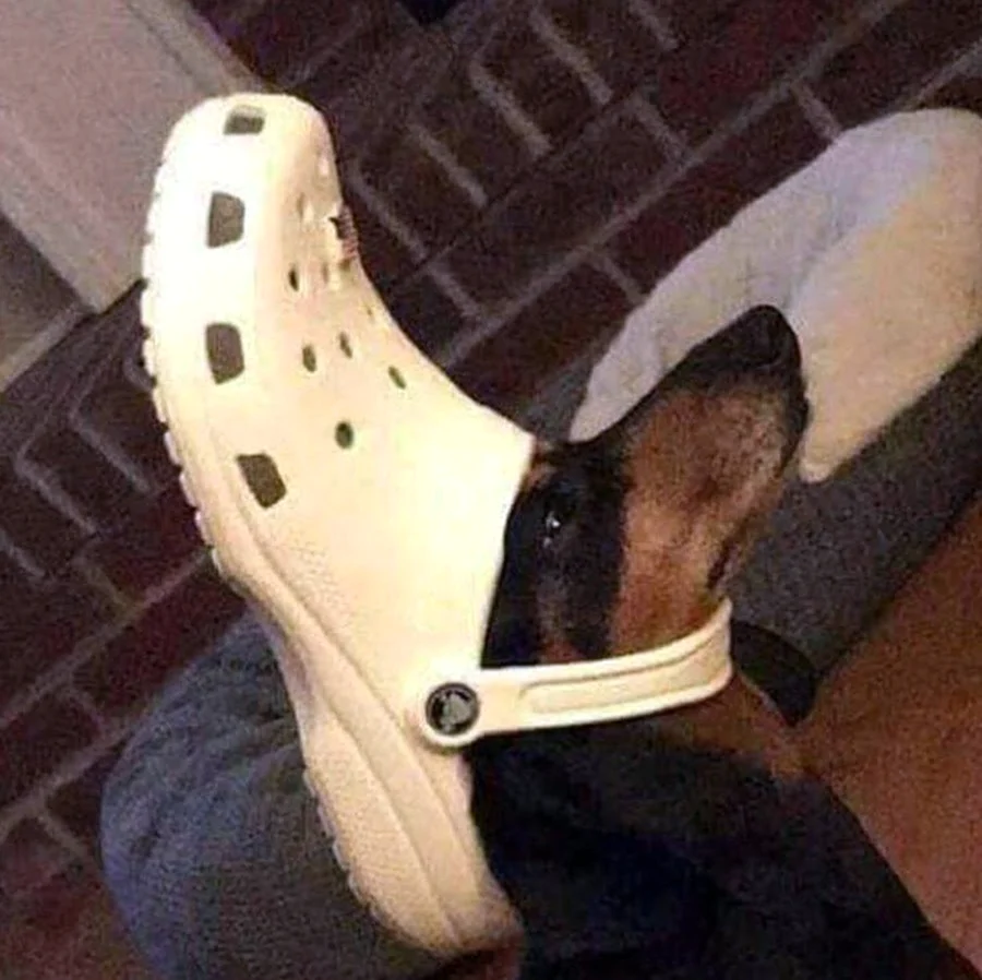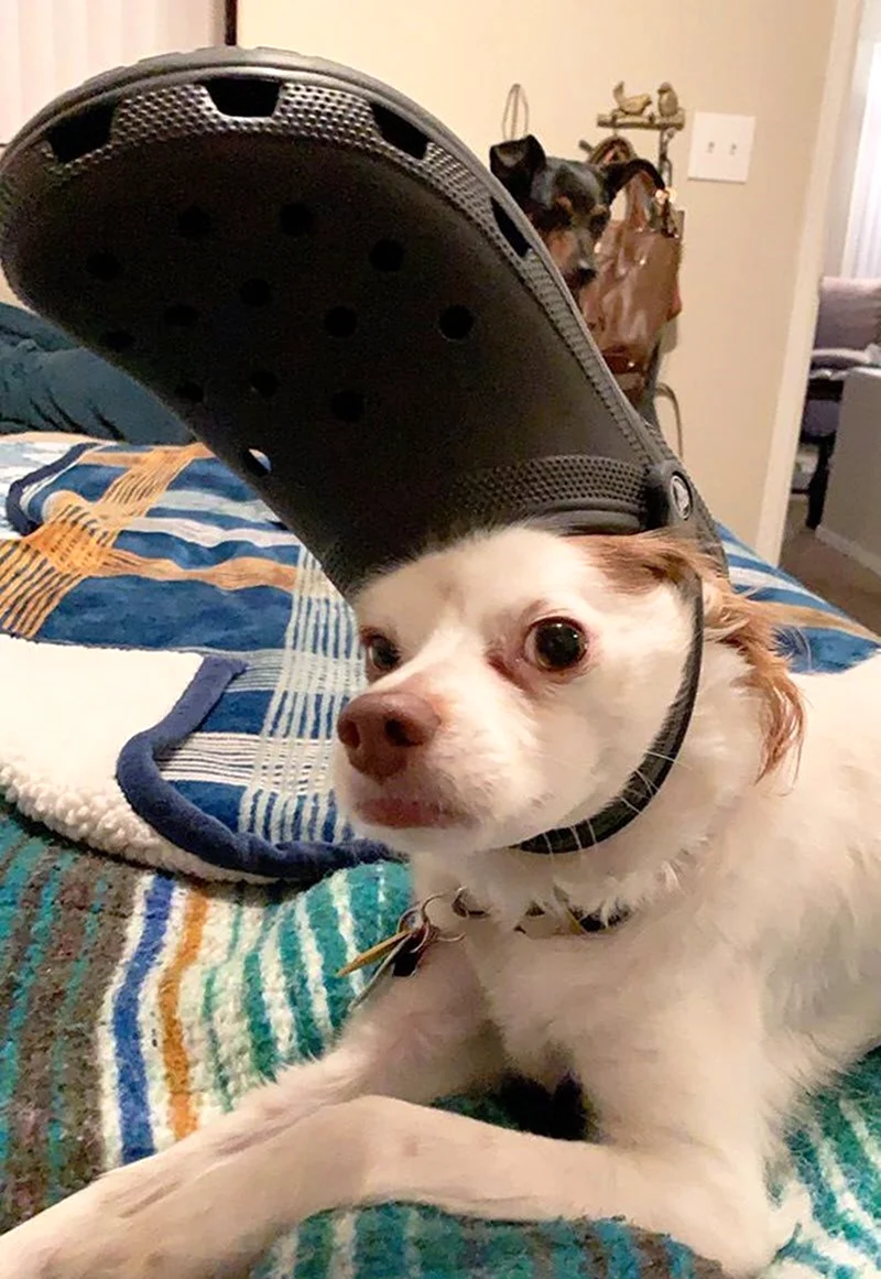 Какой стильняшка! Собака, похоже, готова покорять мир в этих шикарных кроксах!