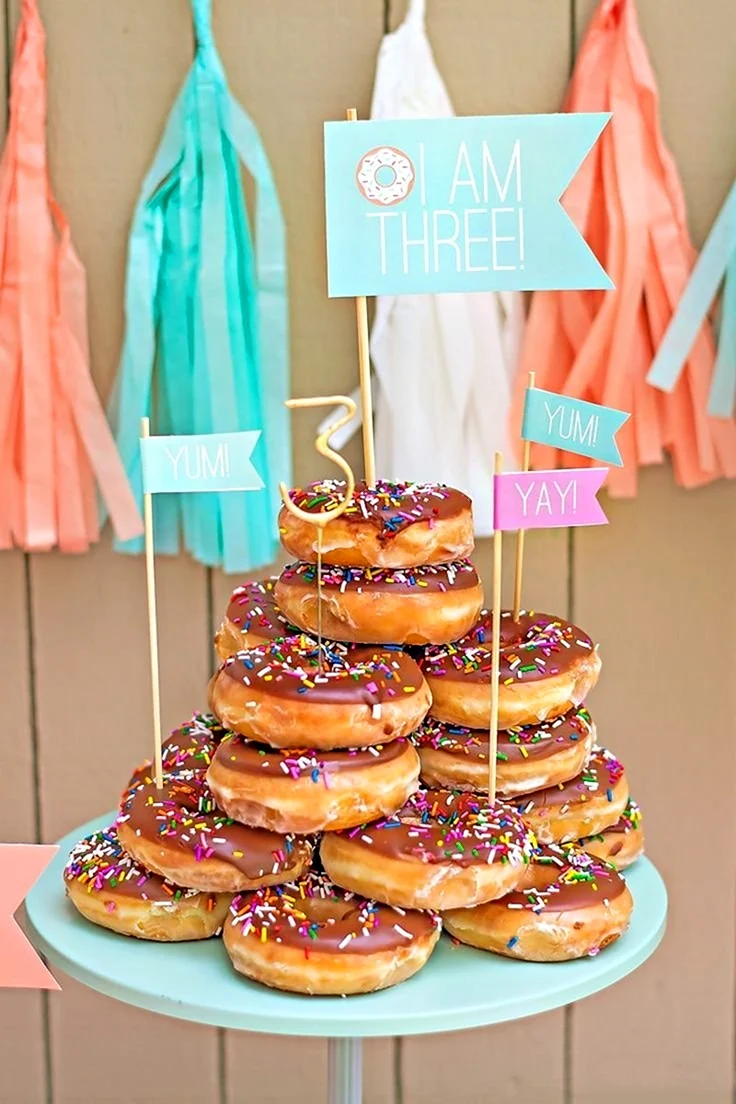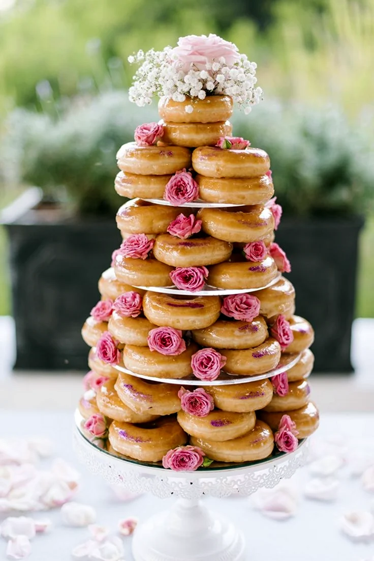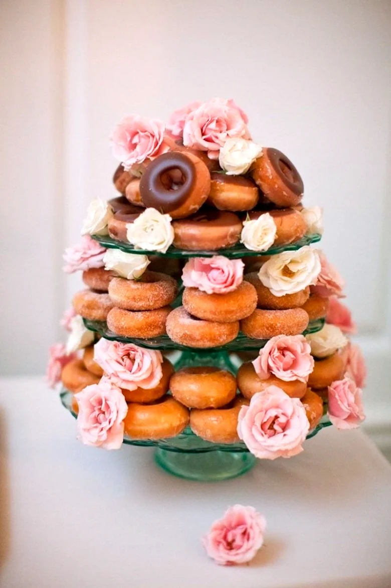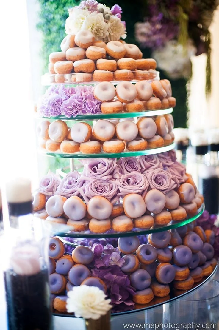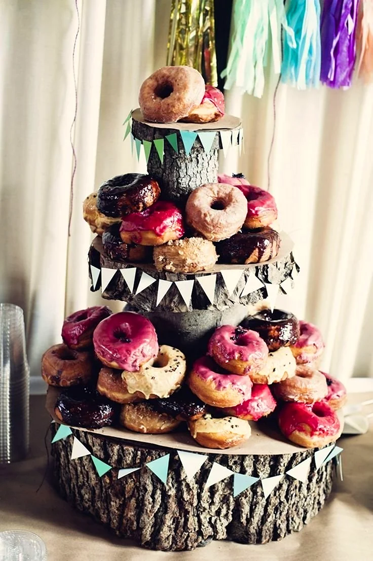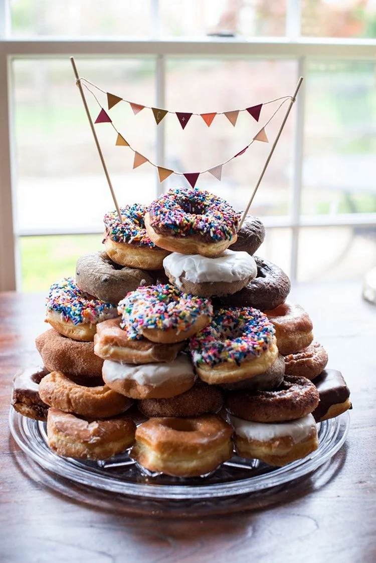 Когда увидел этот торт из пончиков, я думал, что это просто гениально! Кто бы мог подумать, что так можно украсить стол. И пончики, и торт — вот это комбо! Я бы с удовольствием попробовал такой десерт на своем дне рождения!