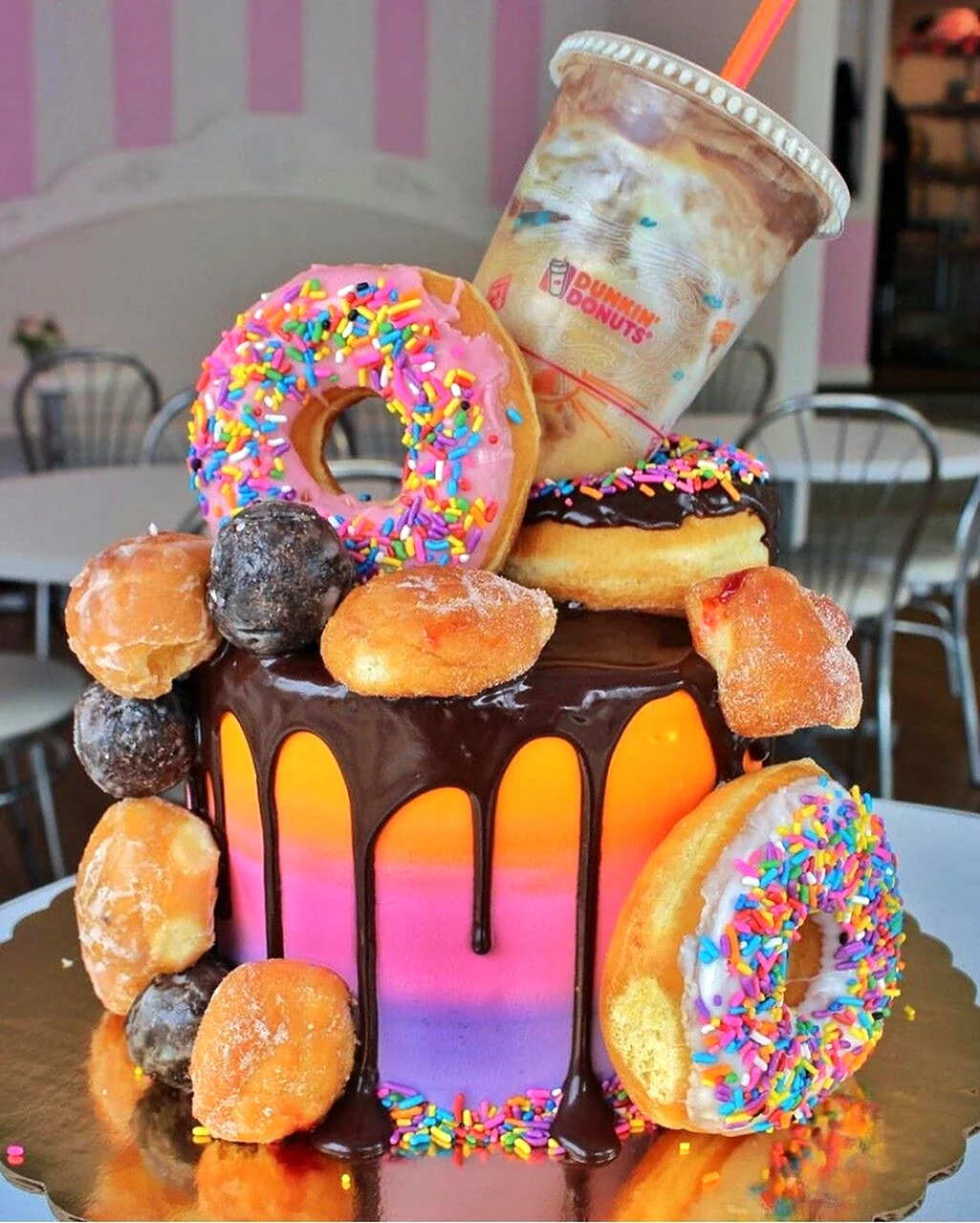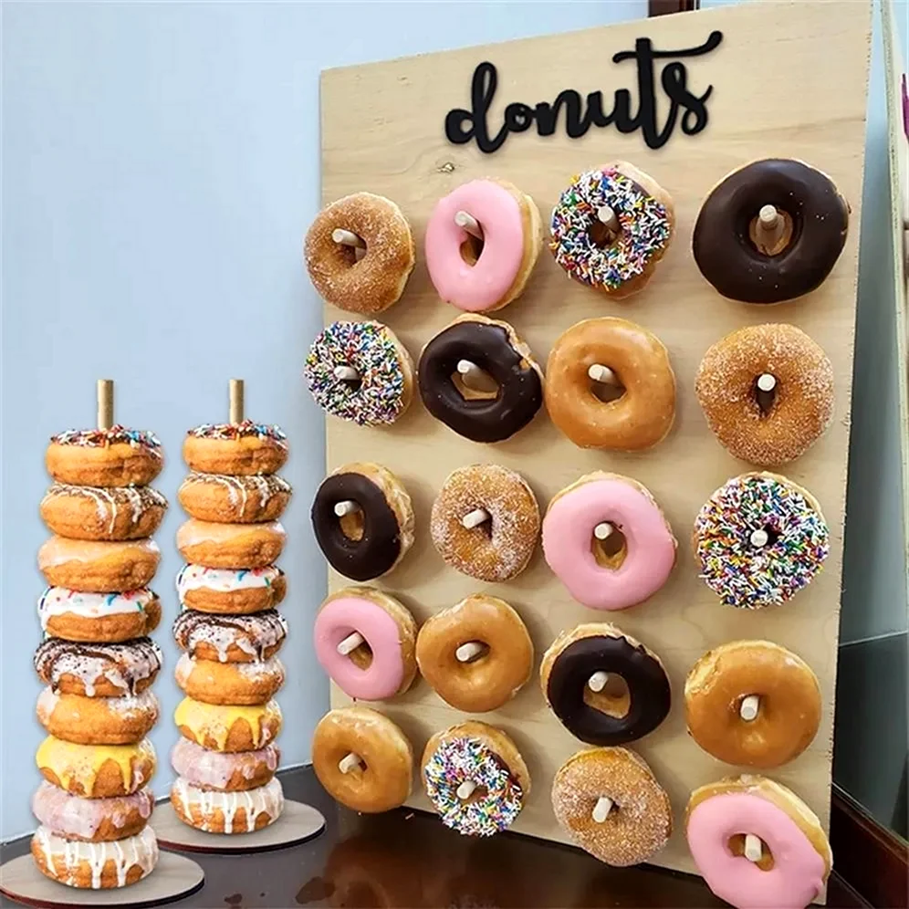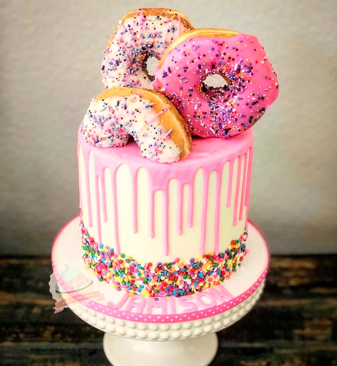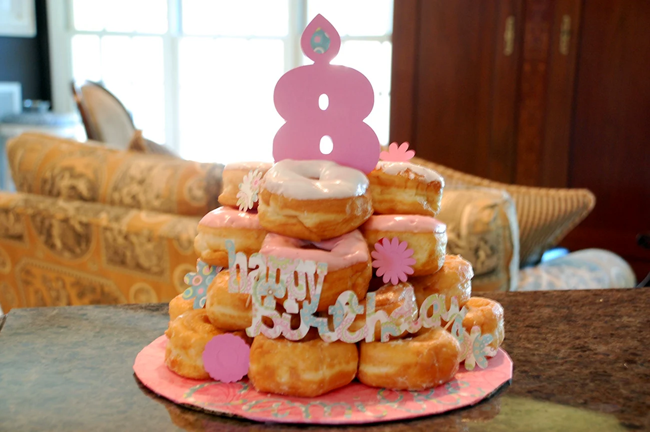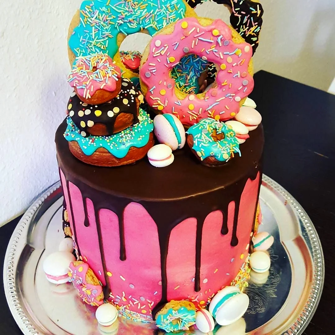 Когда увидел этот торт из пончиков, я думал, что это просто гениально! Кто бы мог подумать, что так можно украсить стол. И пончики, и торт — вот это комбо! Я бы с удовольствием попробовал такой десерт на своем дне рождения!