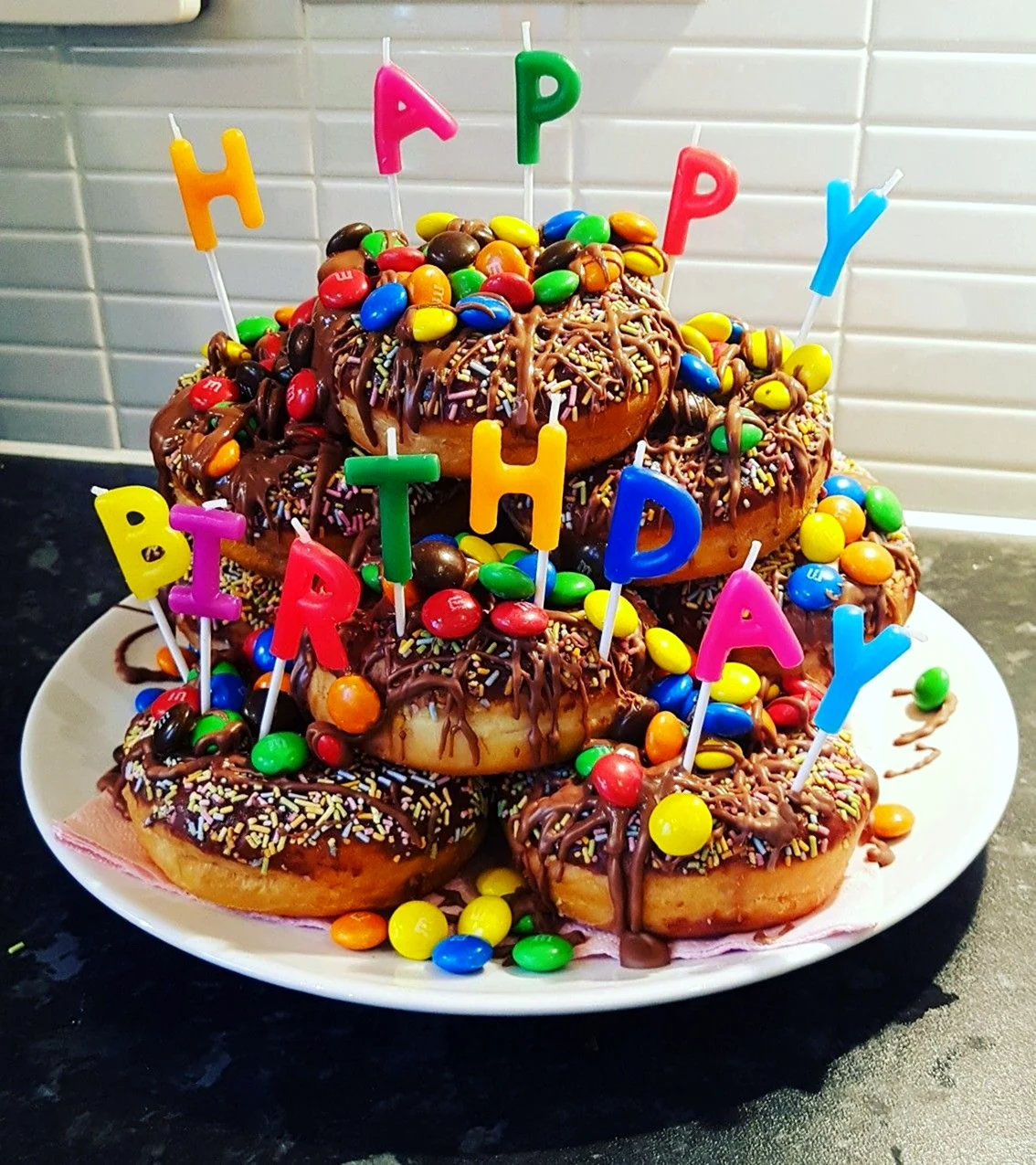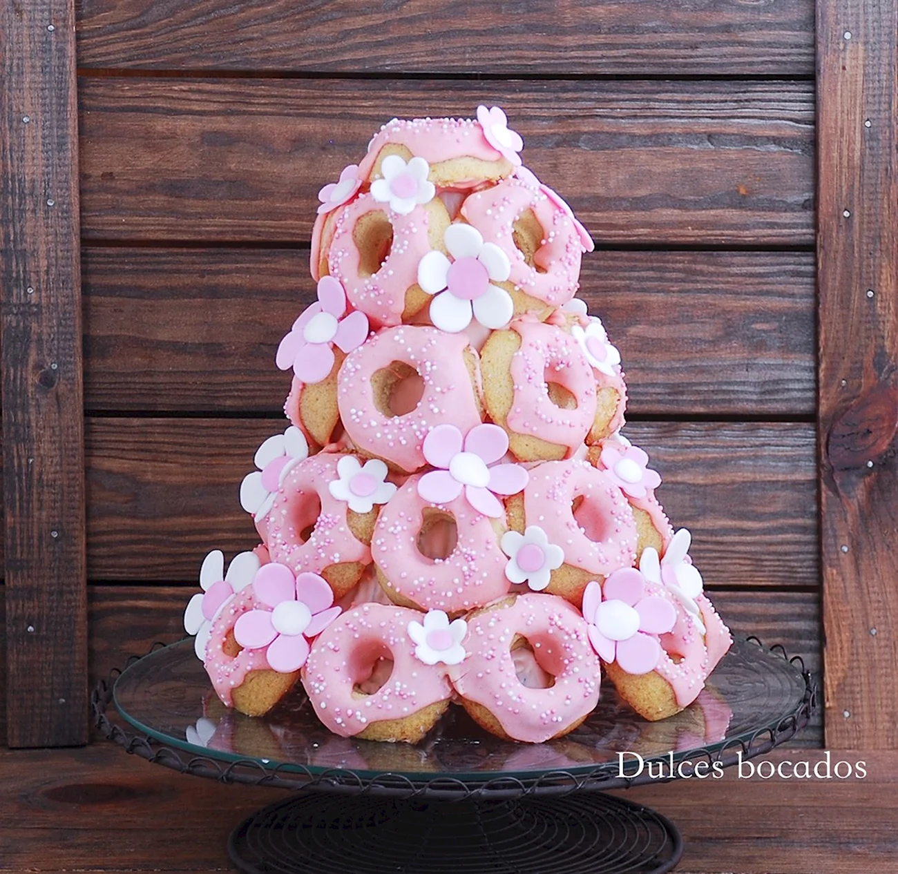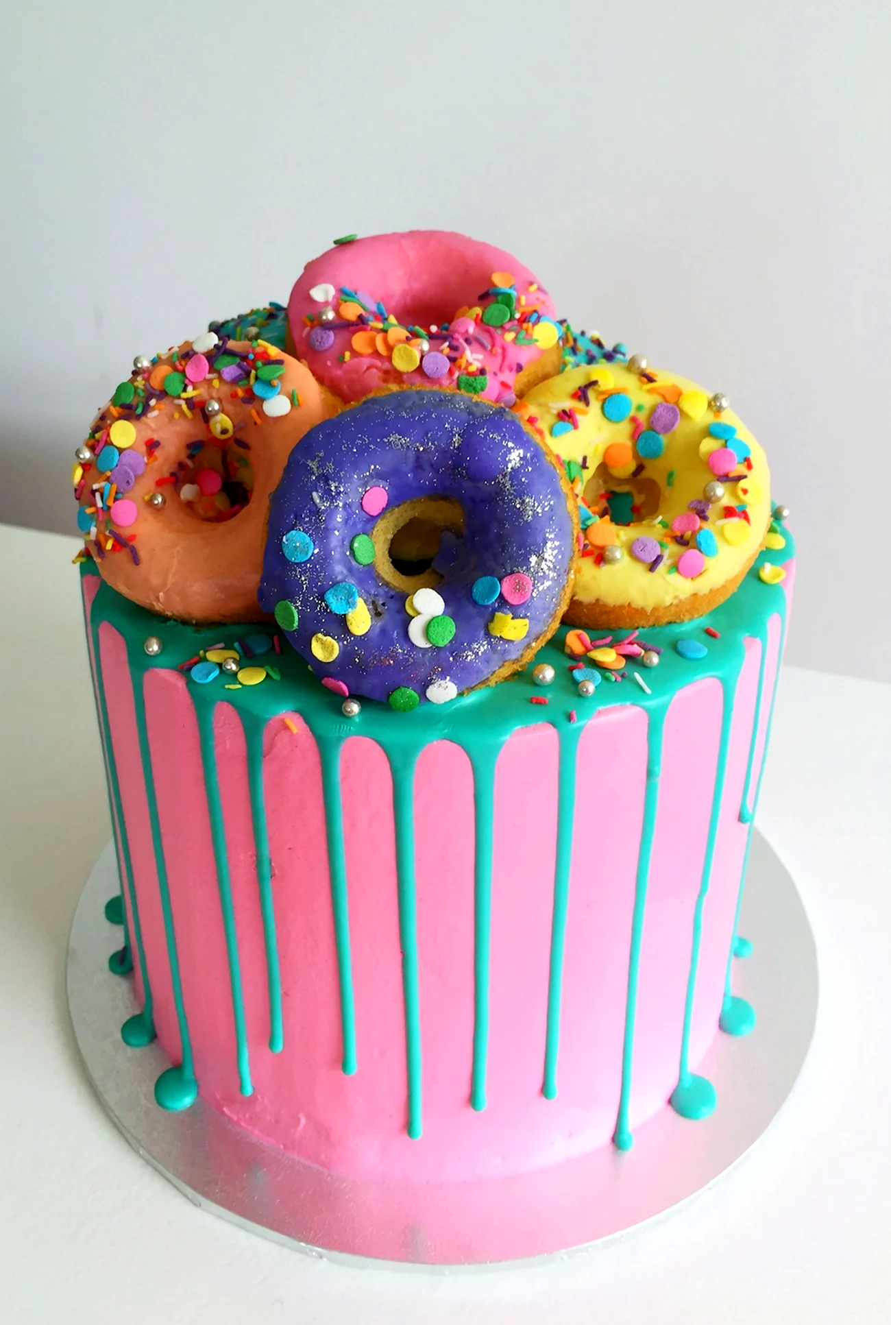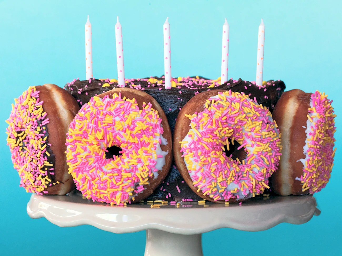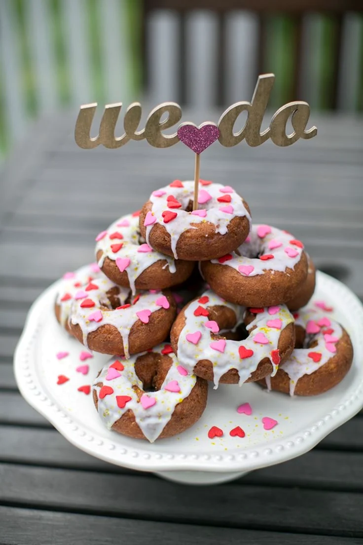 Когда увидел этот торт из пончиков, я думал, что это просто гениально! Кто бы мог подумать, что так можно украсить стол. И пончики, и торт — вот это комбо! Я бы с удовольствием попробовал такой десерт на своем дне рождения!