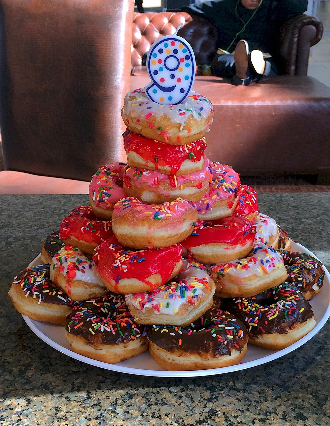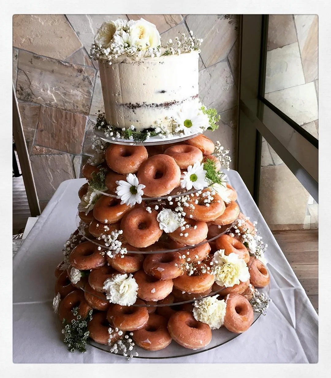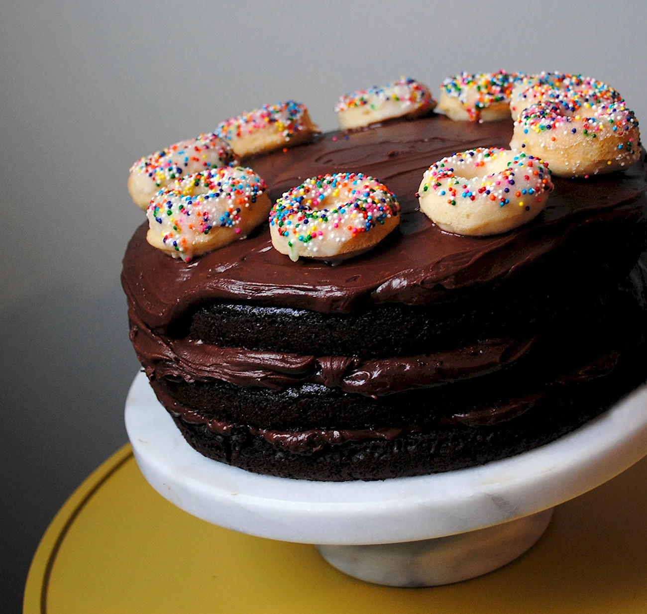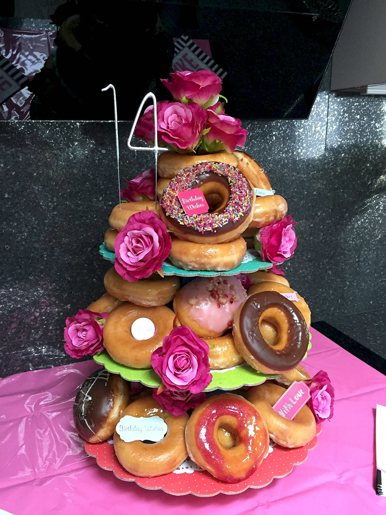 Когда увидел этот торт из пончиков, я думал, что это просто гениально! Кто бы мог подумать, что так можно украсить стол. И пончики, и торт — вот это комбо! Я бы с удовольствием попробовал такой десерт на своем дне рождения!