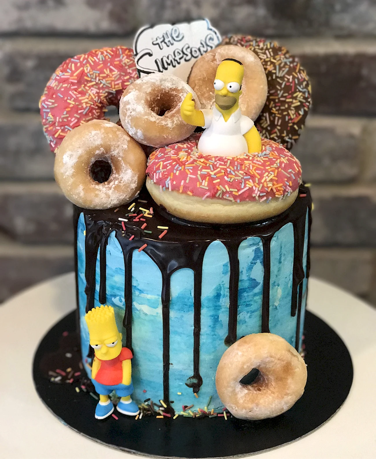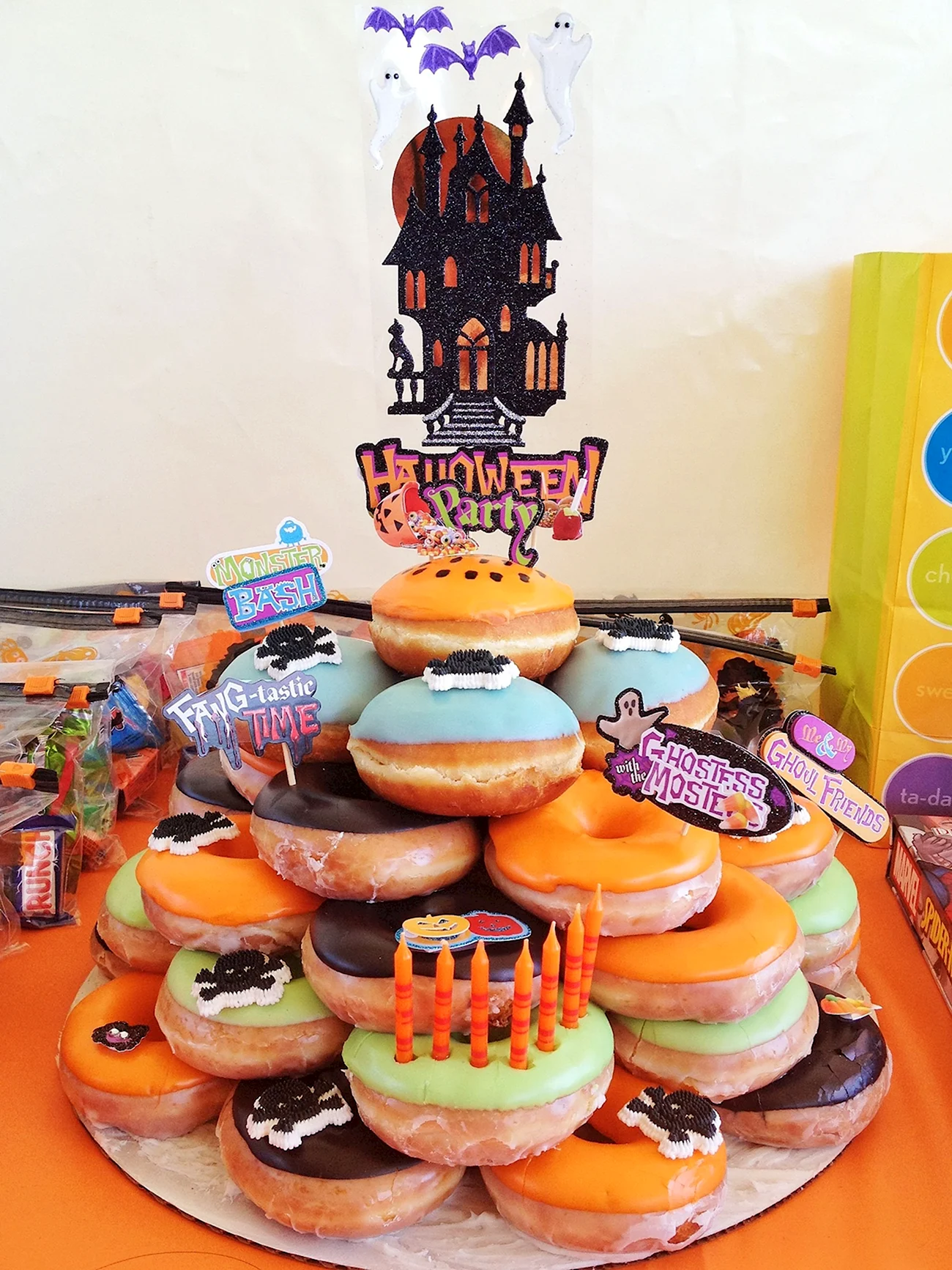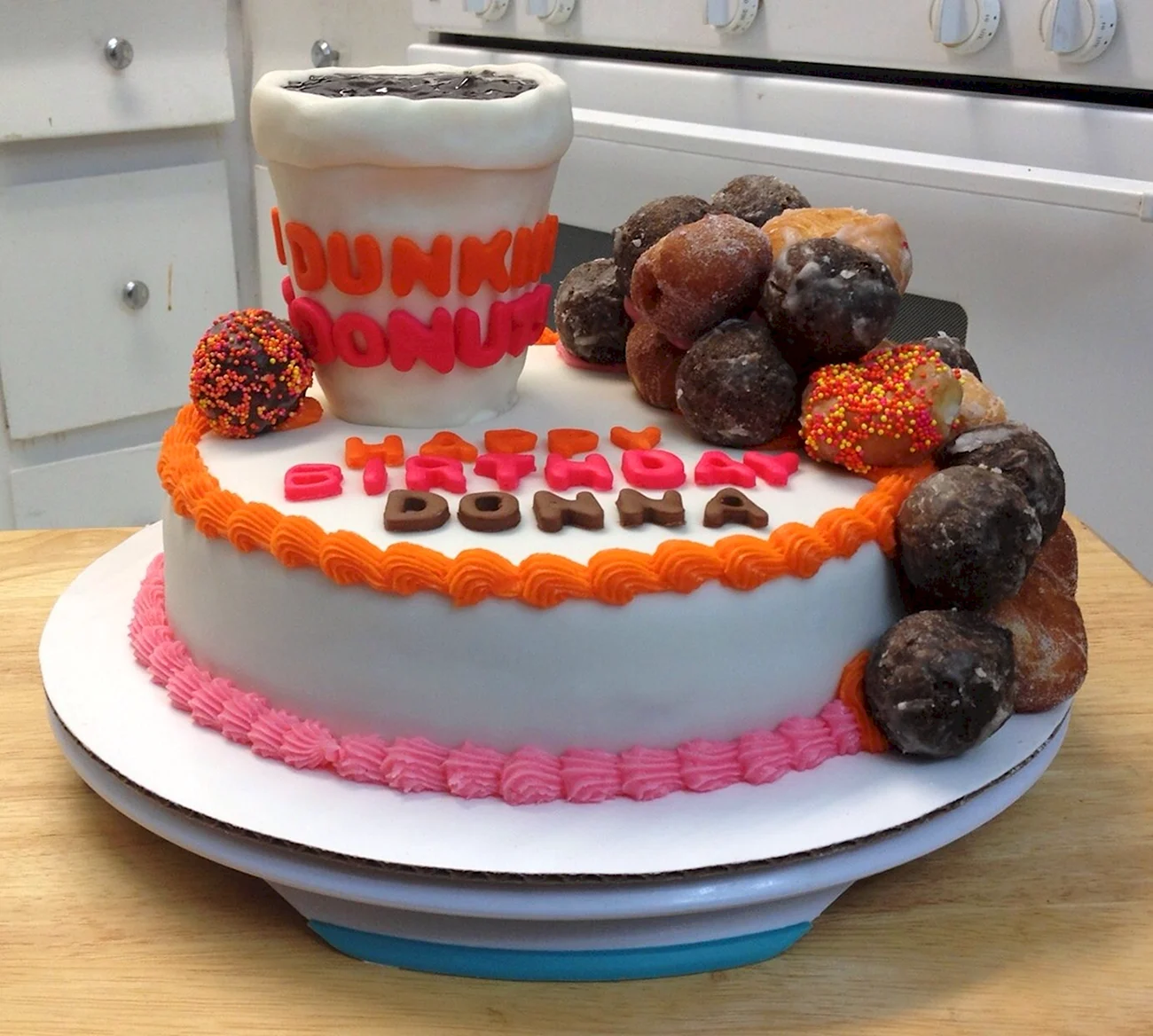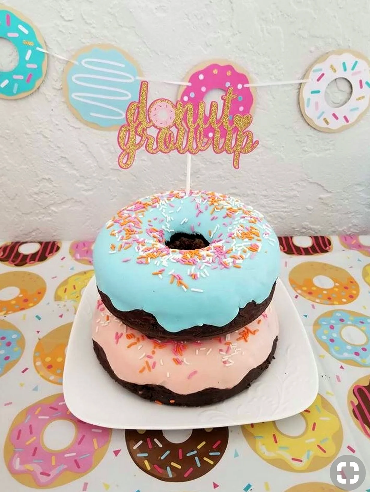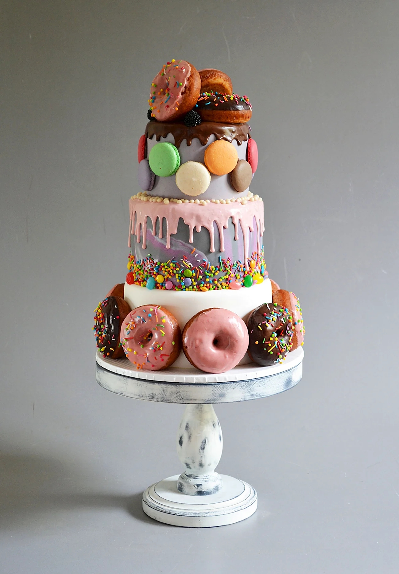 Когда увидел этот торт из пончиков, я думал, что это просто гениально! Кто бы мог подумать, что так можно украсить стол. И пончики, и торт — вот это комбо! Я бы с удовольствием попробовал такой десерт на своем дне рождения!