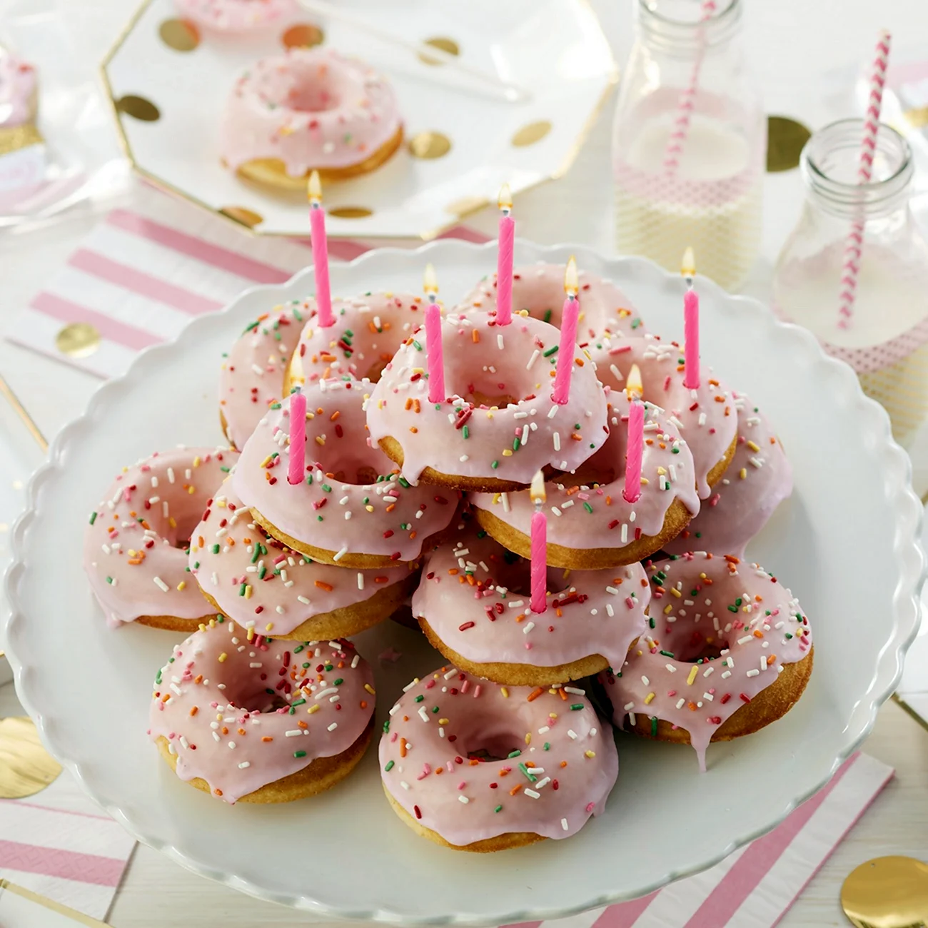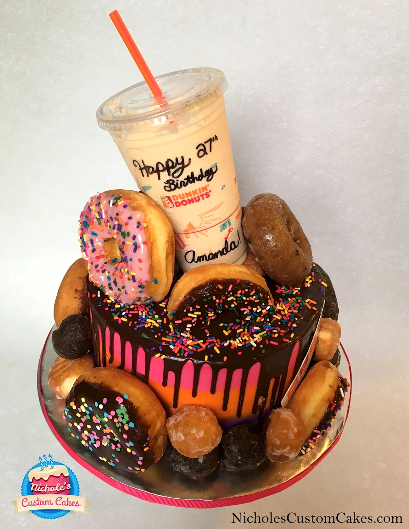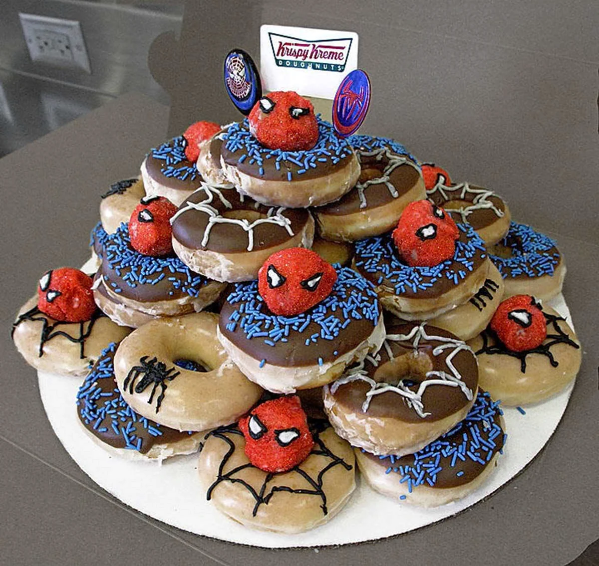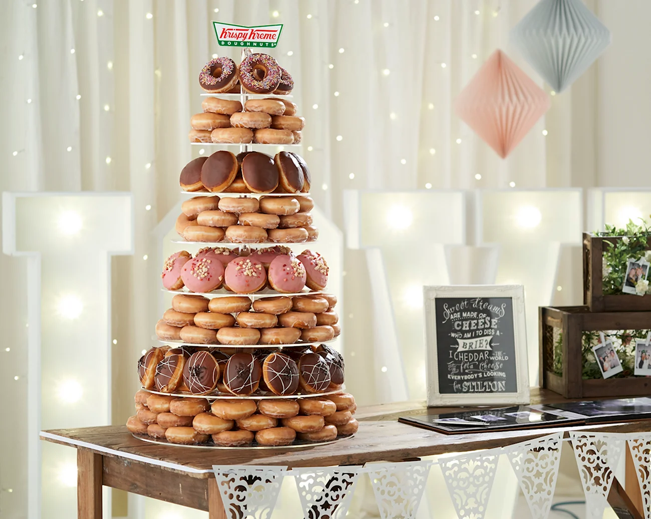 Когда увидел этот торт из пончиков, я думал, что это просто гениально! Кто бы мог подумать, что так можно украсить стол. И пончики, и торт — вот это комбо! Я бы с удовольствием попробовал такой десерт на своем дне рождения!