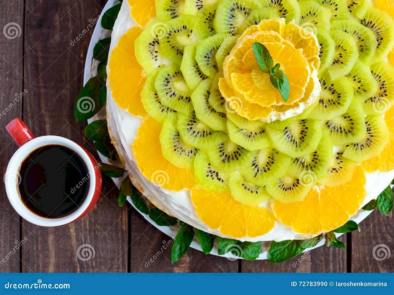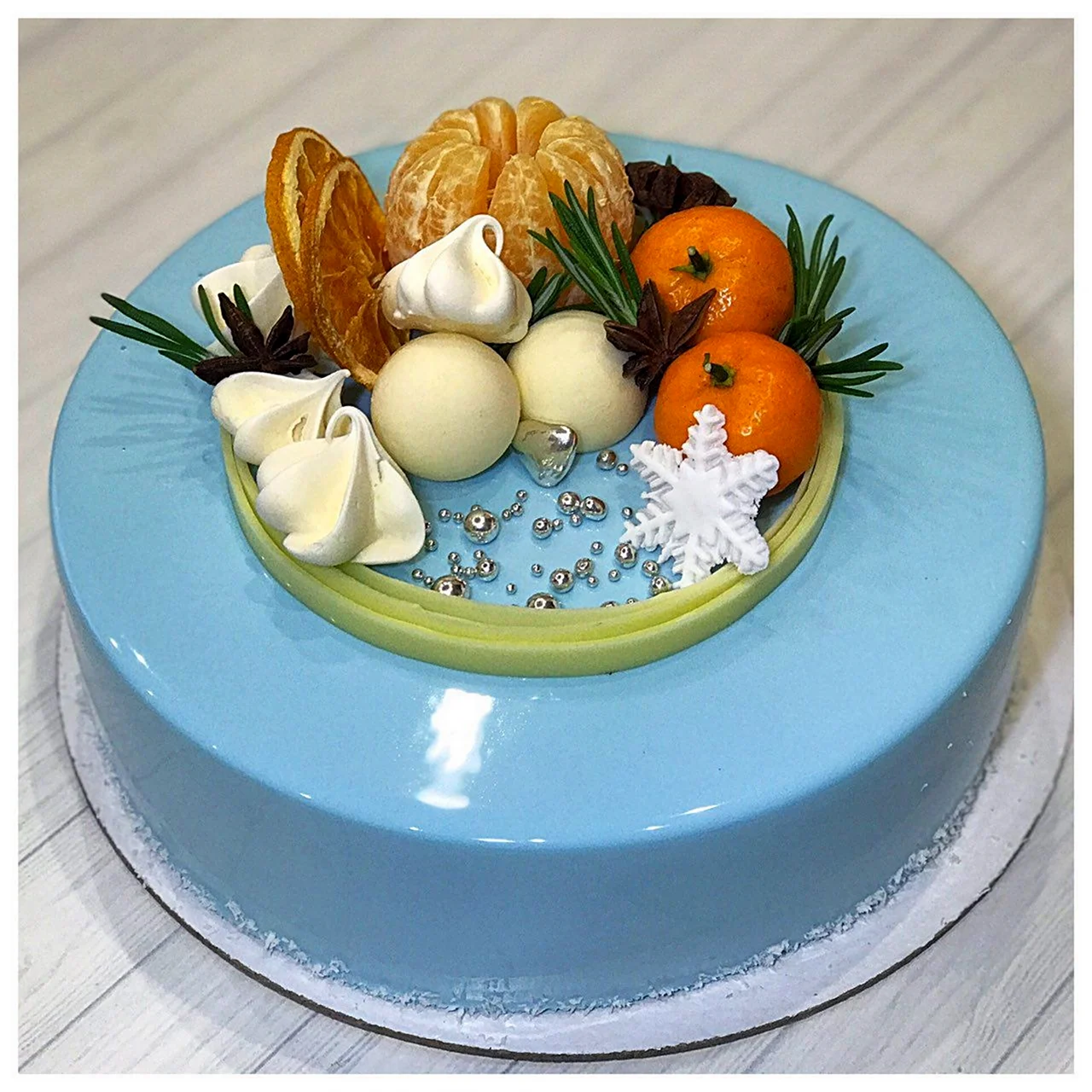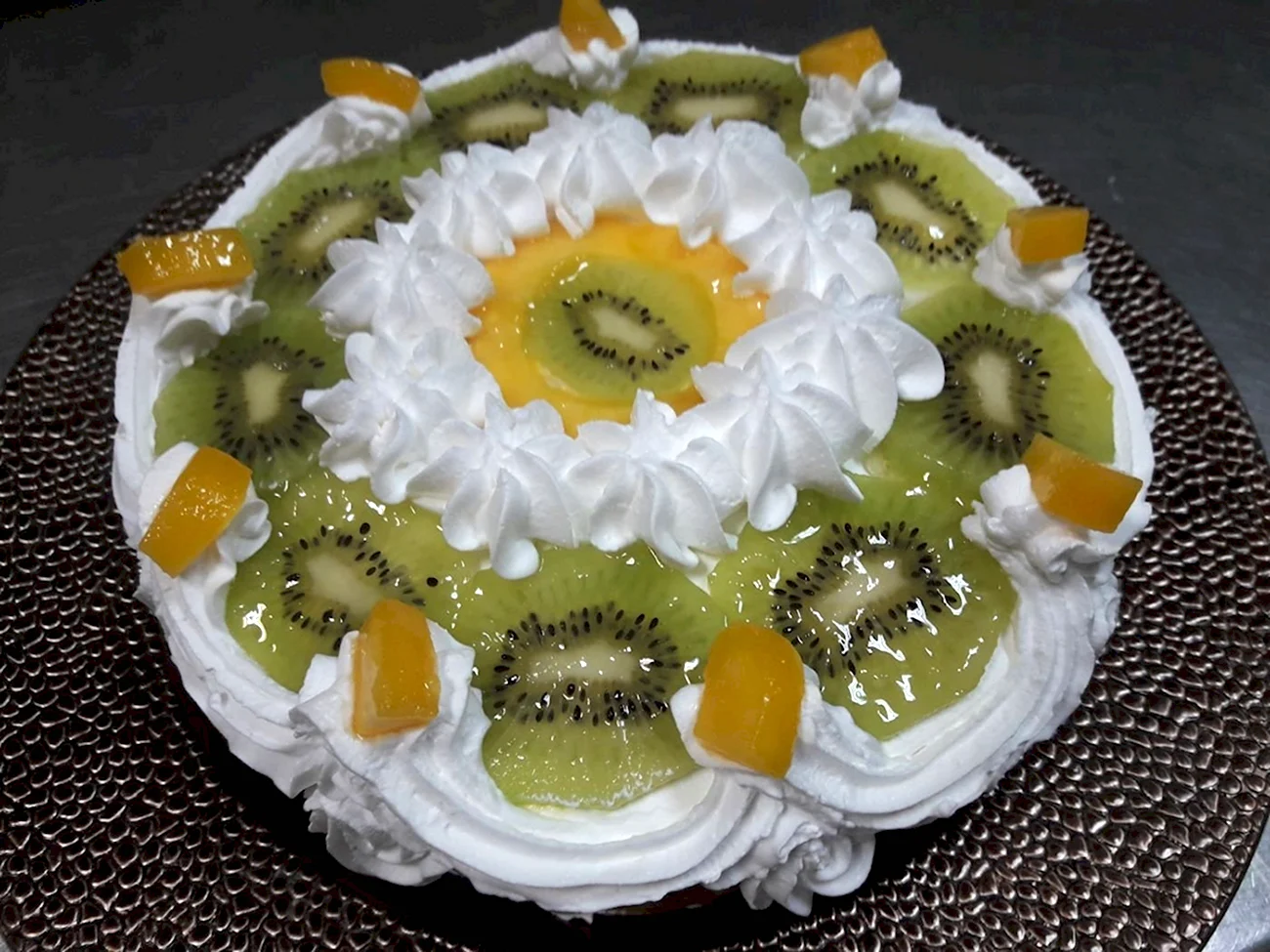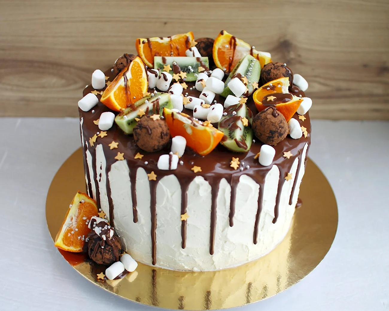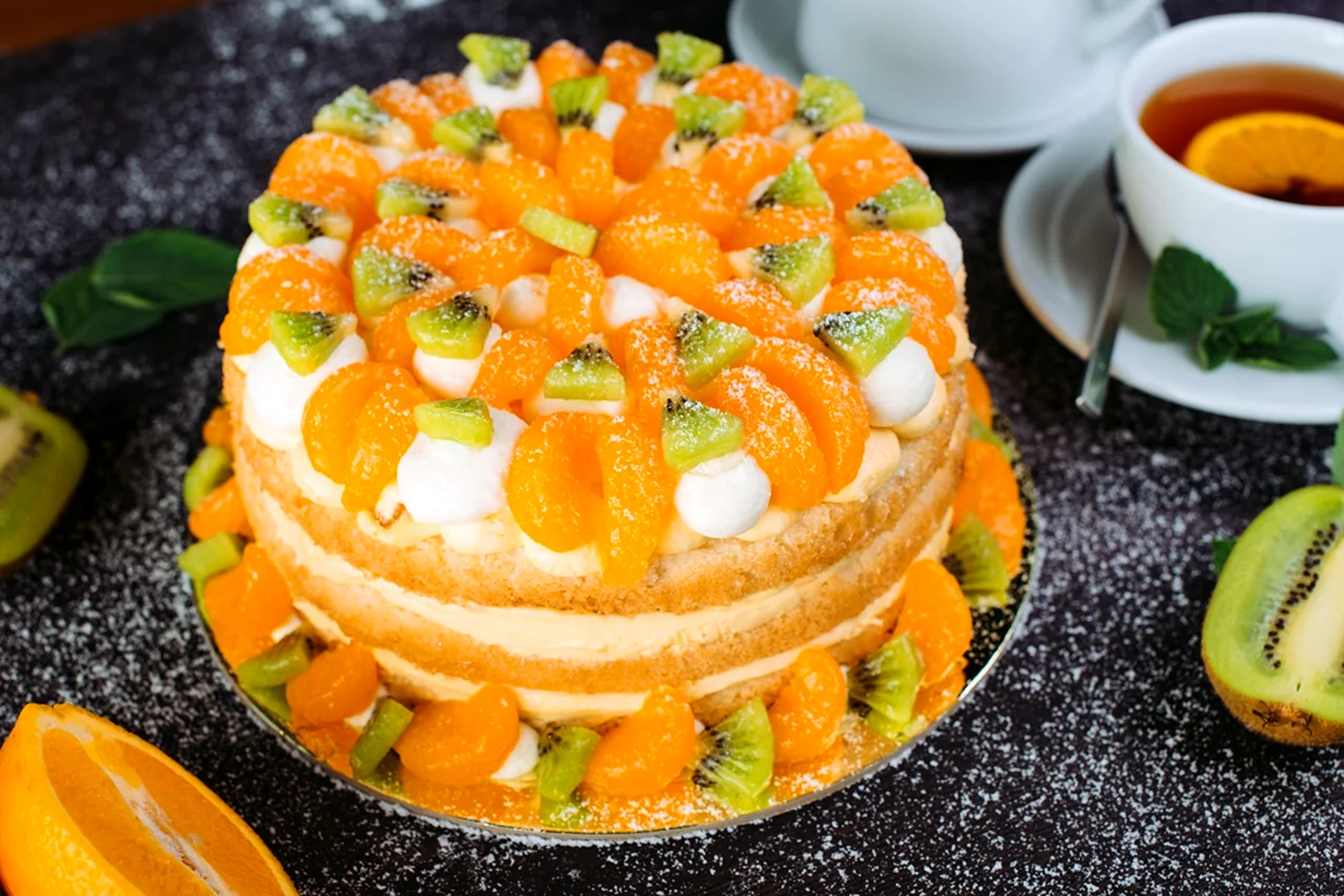 Красиво декорированный торт с яркими кусочками киви и мандарина добавит особый шарм любому празднику.