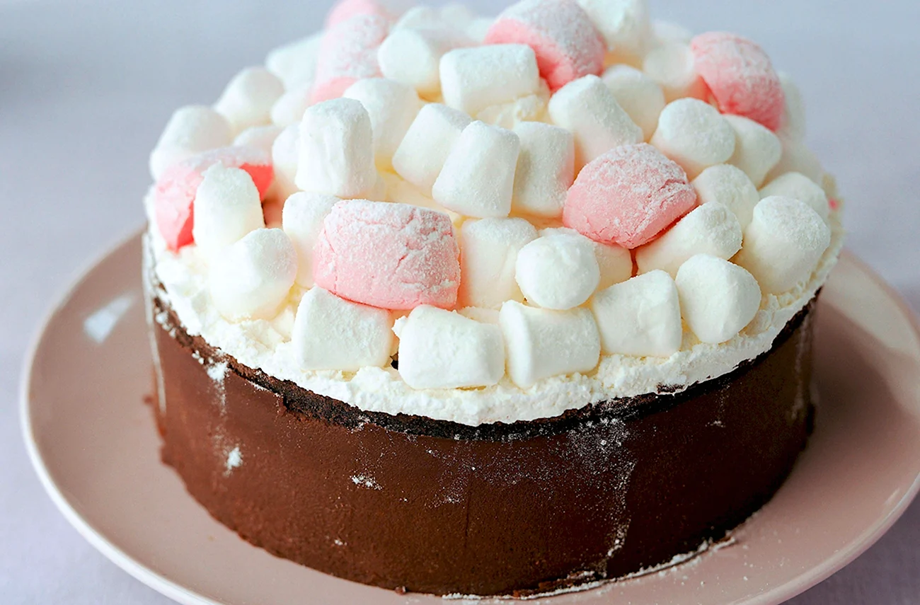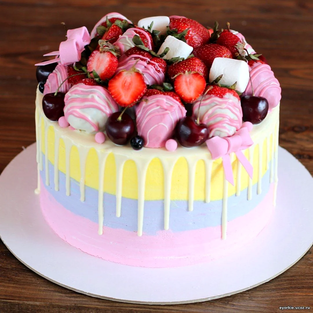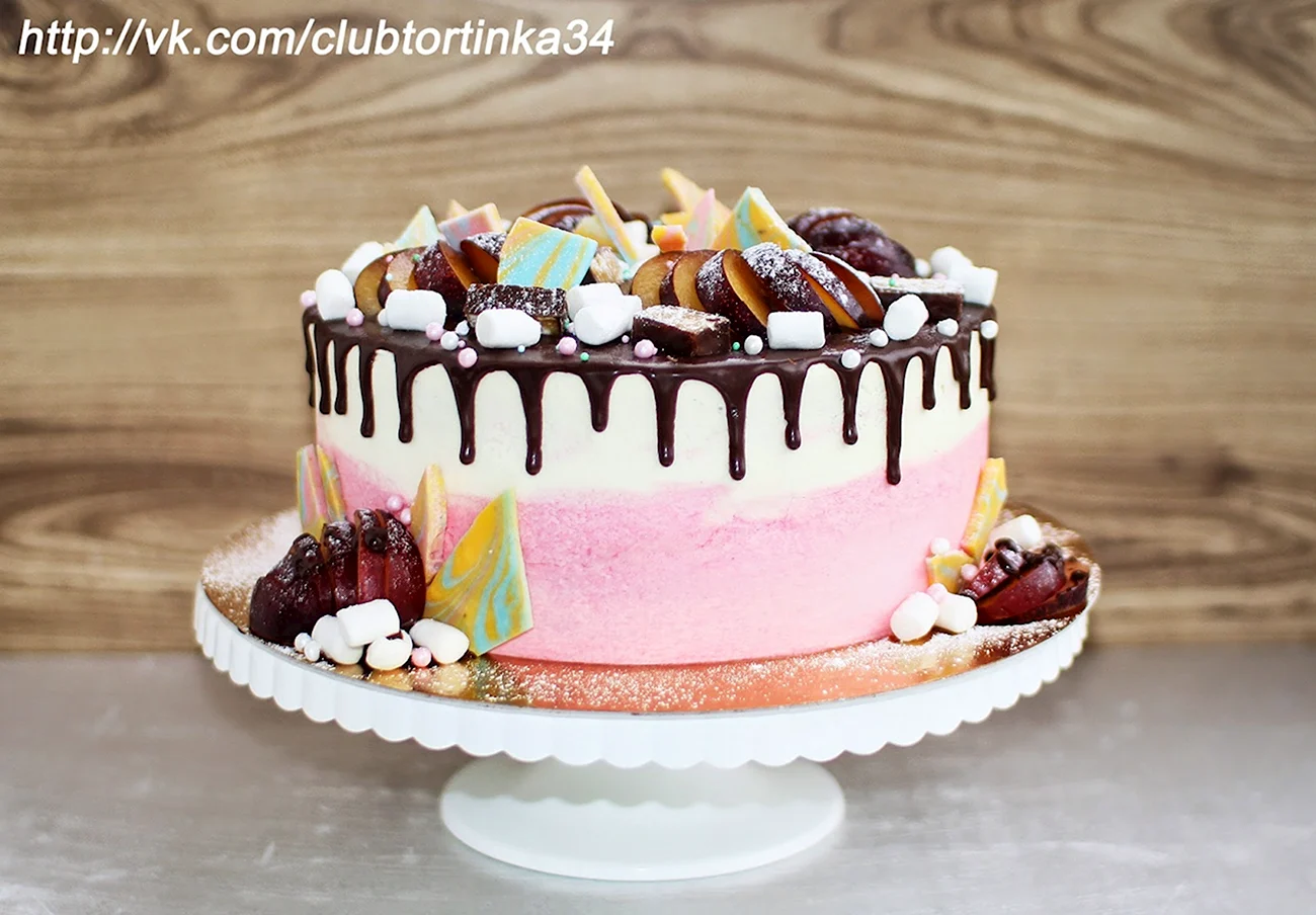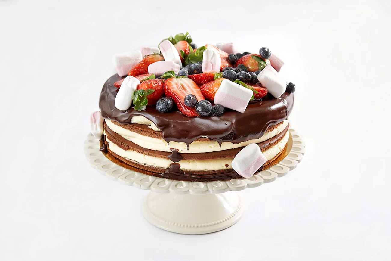 Какой сладкий взрыв вкуса! Фрукты с маршмеллоу — просто идеальное сочетание для торта, и выглядит так аппетитно, что не знаю, с чего начать — с украшения или с кусочка!