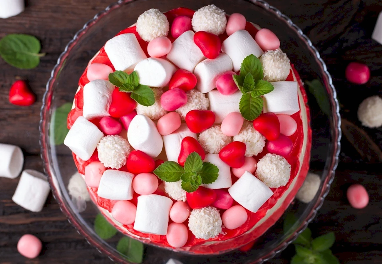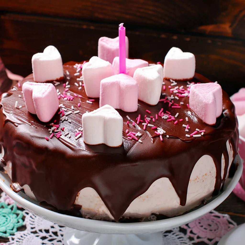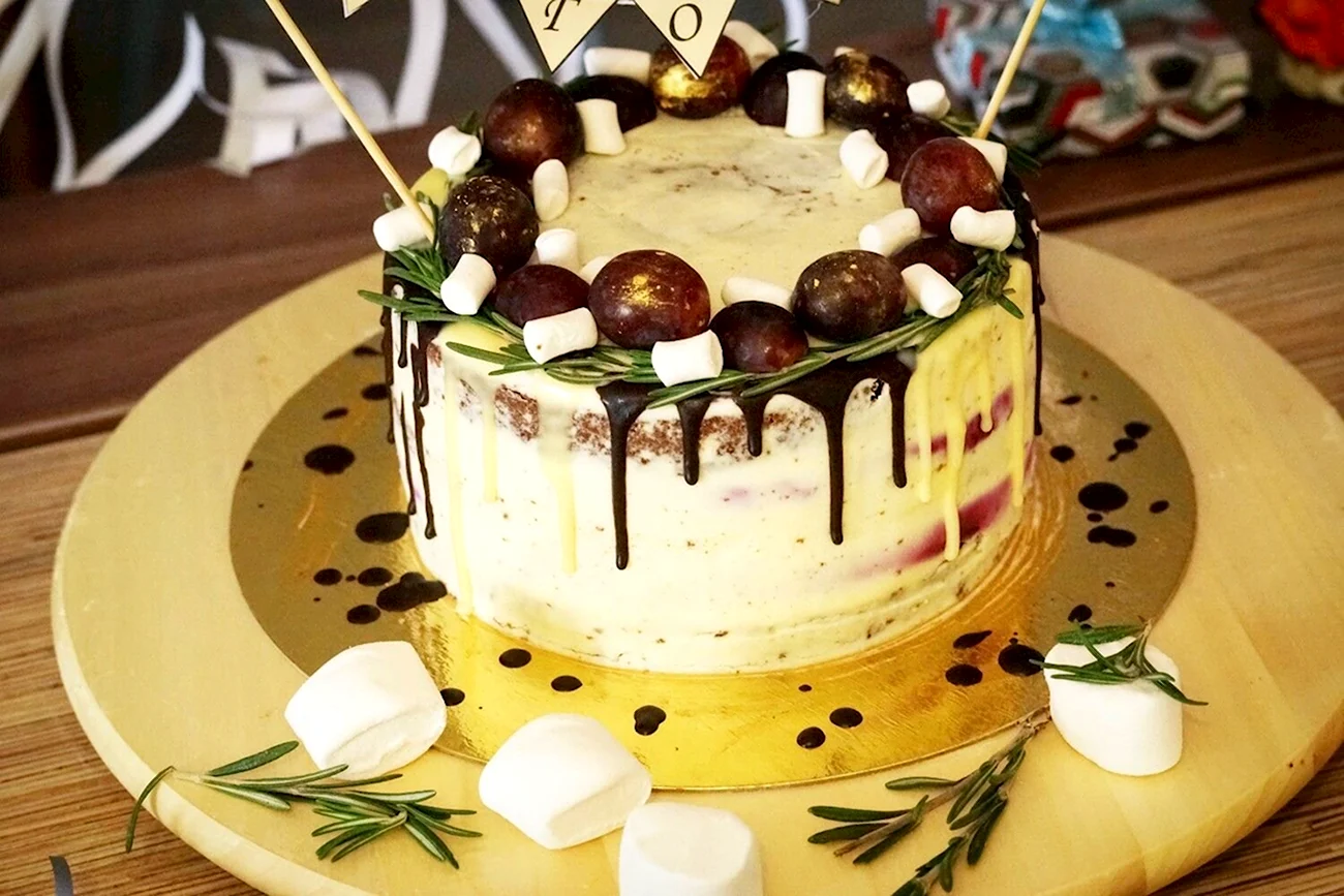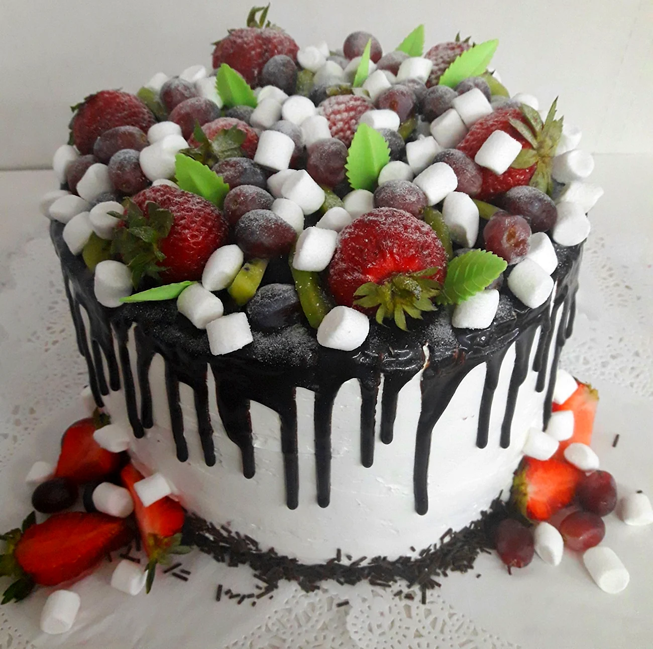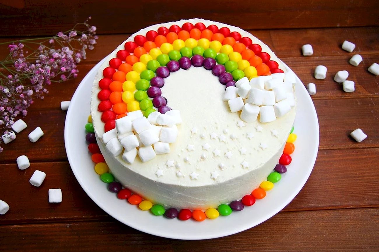 Какой сладкий взрыв вкуса! Фрукты с маршмеллоу — просто идеальное сочетание для торта, и выглядит так аппетитно, что не знаю, с чего начать — с украшения или с кусочка!